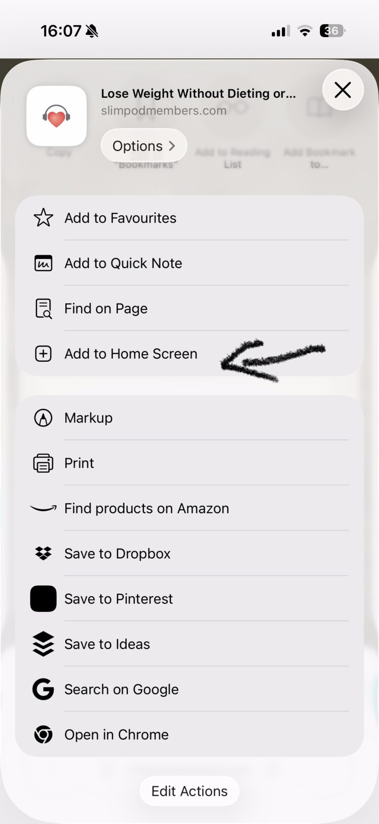 - A new menu pops up. Scroll down that menu until you see “Add to Home Screen” and click on that.
